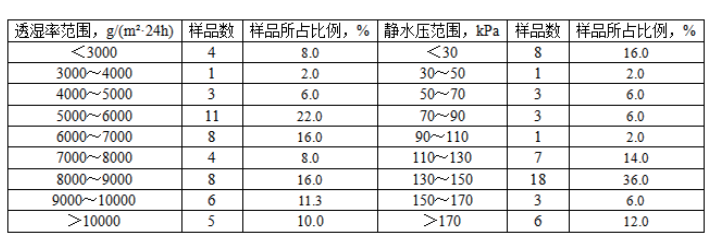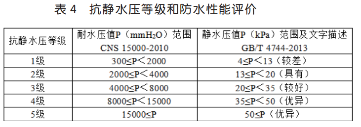 可見,防水透濕面料倒杯 - 蒸發(fā)法的透濕率基本符合正態(tài)分布,≤ 4000g/(m2·24h)的比例為10.0%,> 10000g/(m2·24h)的比例 10.0%,一半以上測試結果集中在 5000~ 9000 g/(m2·24h)。而靜水壓測試結果相對比較分散,≤ 30kPa 的比例為 16.0%,> 170kPa 的比例為 12.0%,70% 以上的測試結果大于 70kPa。以 GB/T 32614-2016《戶外運動服裝 沖鋒衣》中對沖鋒衣面料 I 級功能性要求而言,即洗滌前透濕率≥ 5000g/(m2·24h),靜 水 壓 ≥ 50kPa,50 塊 面 料 透 濕 率 合 格 率 為84.0%,靜水壓合格率為 82.0%,合格率基本一致。但靜水壓指標相對更好,三分之二的樣品靜水壓> 100kPa,遠遠滿足標準要求,這也驗證了靜水壓指標通過在織物表面的涂層處理很容易符合標準要求。將 GB/T 4744-2013《紡織品 防水性能的檢測和評價 靜水壓法》及臺灣標準 CNS 15000-2010《防水透濕紡織品性能評估》[8] 對靜水壓的評價性能列如表 4 所示。