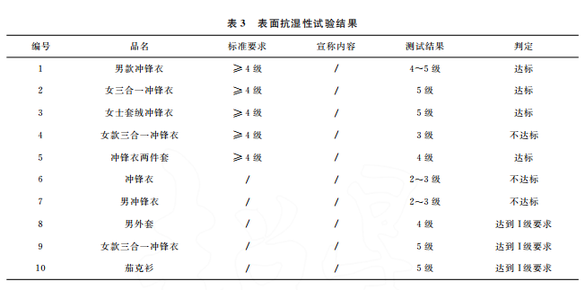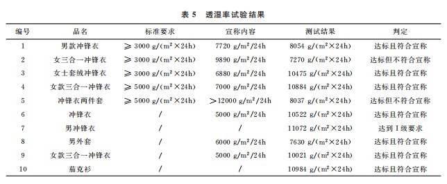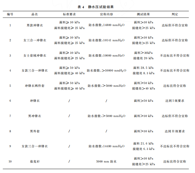 本文最終的判定是結合 GB/T32614—2016《戶外運動服裝 沖鋒衣》中面料功能性要求和產品銷售時的吊牌宣稱進行。達標是指符合沖鋒衣的合格品 標 準 要 求,反 之 則 不 符 合。10 件 樣 品中,只有5件達標,且只有3件是符合吊牌宣稱內容。其中,標示了 GB/T32614—2016的沖鋒衣,有3件達標,合格率為60%。近年來,監管部門的抽查合格率一般在80%左右。這次比較試驗合格率偏低的原因可能是樣品量較少,樣品的價格區間比較集中,且考核了接縫處的靜水壓。值得注意的是有2件沒有標示 GB/T32614—2016的外套,其性能都符合標準要求。此外,銷售方對靜水壓的宣稱都偏高,有3件達標了卻不符合自身的宣稱內容。沖鋒衣 GB/T32614—2016標準 中 I級 對 靜 水 壓 的 要 求 也 只是:面料≥50kPa和面料接縫處≥50kPa,銷售 方卻往往宣稱100kPa,甚至達150kPa,而且也沒有充分考慮到面料接縫處靜水壓值會相對偏小的現實。需要警 醒 的 是,5 件 標 示 了 GB/T32614—2016的沖鋒衣其綜合宣傳都不符合規定,存在執行標準標注正確卻夸大宣傳的嫌疑。