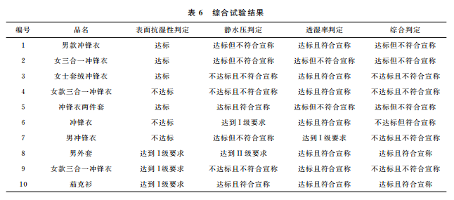 表面抗濕性、靜水壓和透濕率綜合統計的測試結果見表6。
