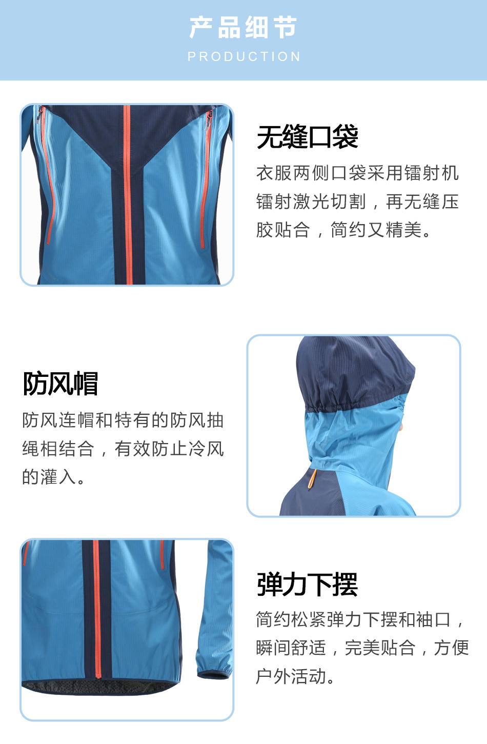 防風(fēng)帽:防風(fēng)連帽和特有的防風(fēng)抽繩相結(jié)合,有效防止冷風(fēng)的灌入。