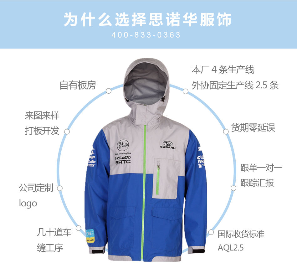 精美繡花:沖鋒衣中融入精致的繡花工藝,可根據客戶要求專業定制沖鋒衣團隊圖案。