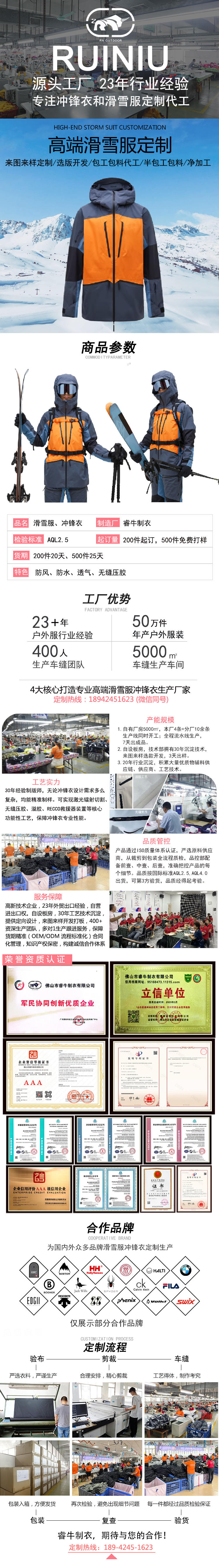 優質面料:專業高端滑雪服定制23年沉淀優質供應商資源,可根據客戶需求精選優質面料。