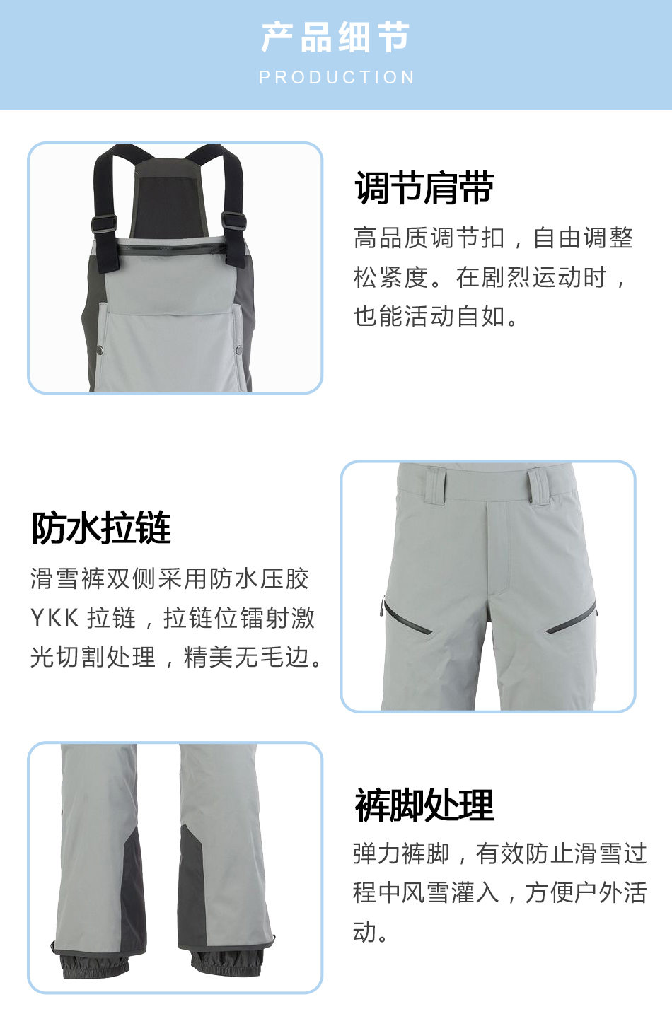 褲腳處理:彈力褲腳,有效防止滑雪過程中風(fēng)雪灌入,方便戶外活動。
